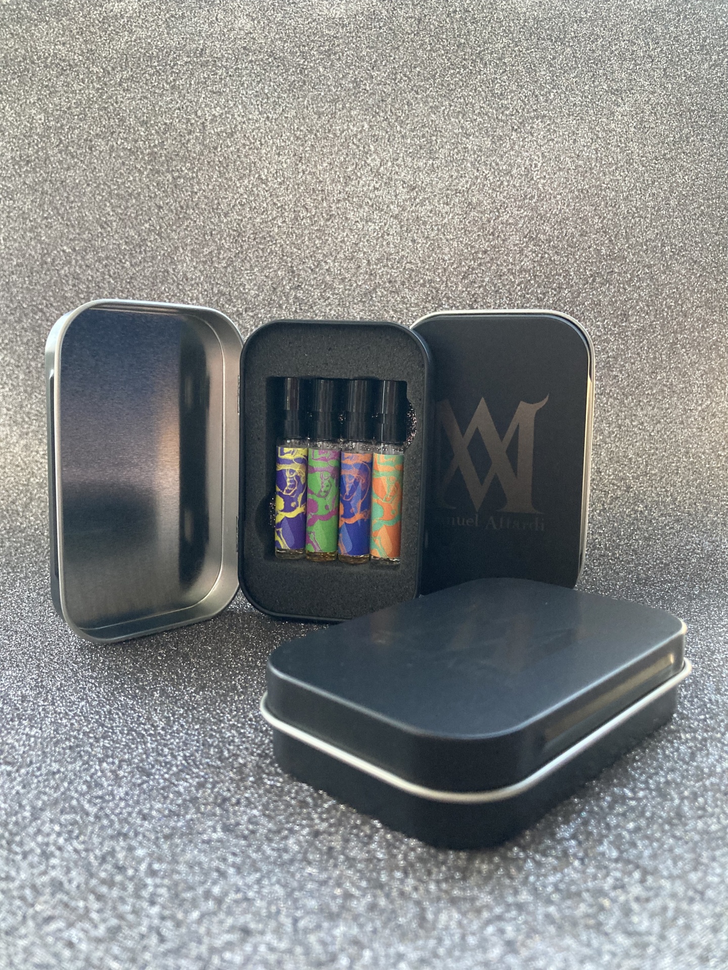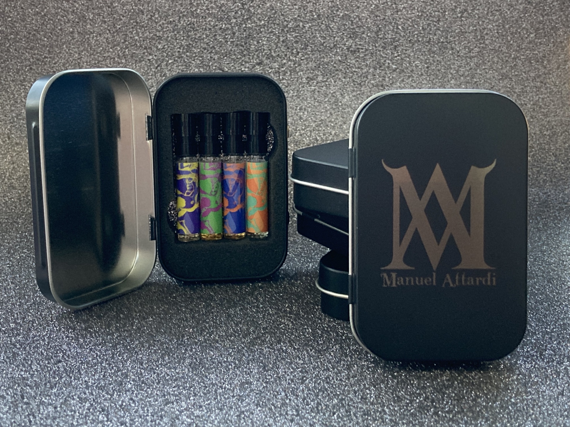 • Estojo metálico preto com quatro frascos pequenos de perfume coloridos e tampa com letras douradas Manuel Altardi