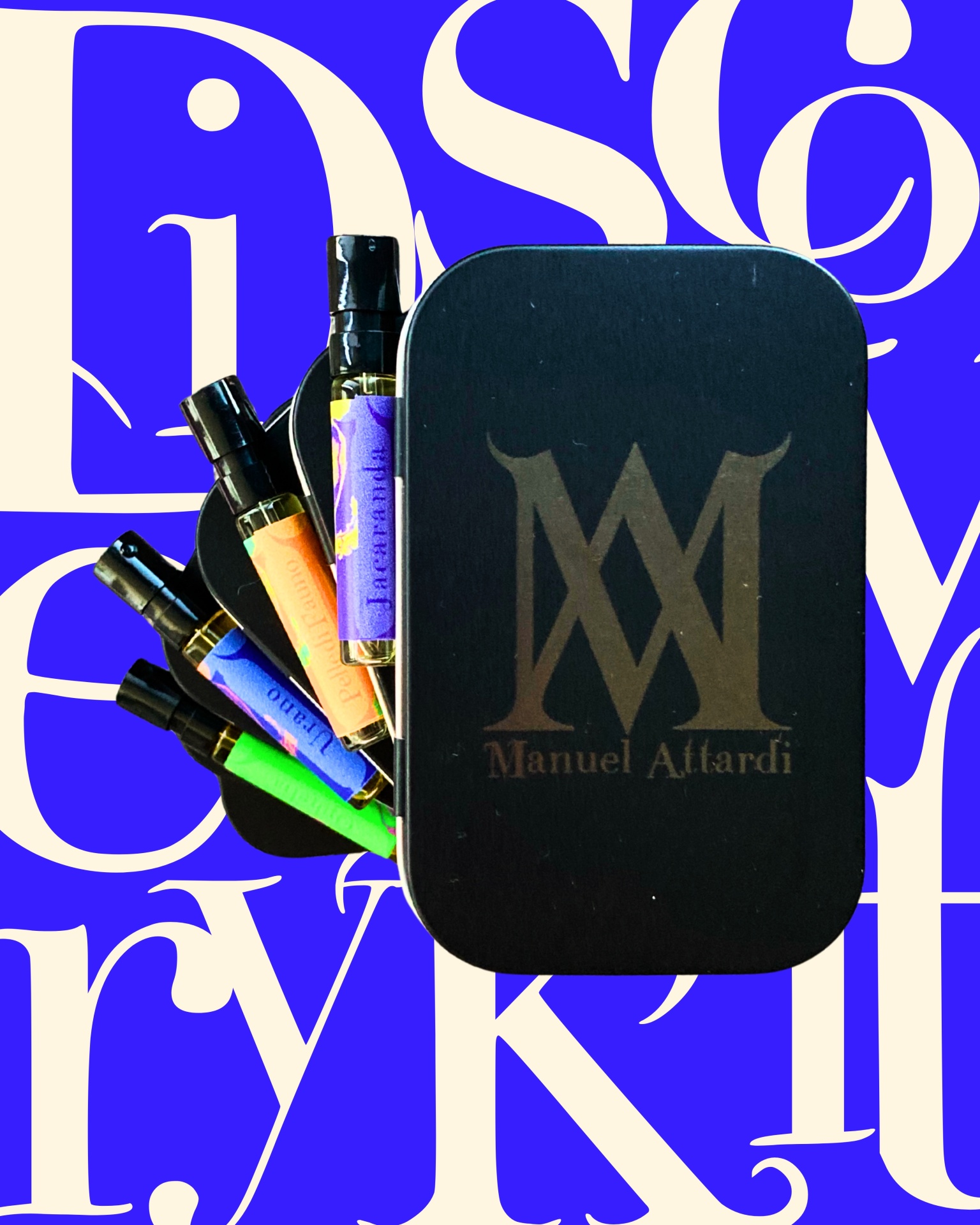 • Black box with Manuel Attardi logo and five small spray bottles with colorful labels